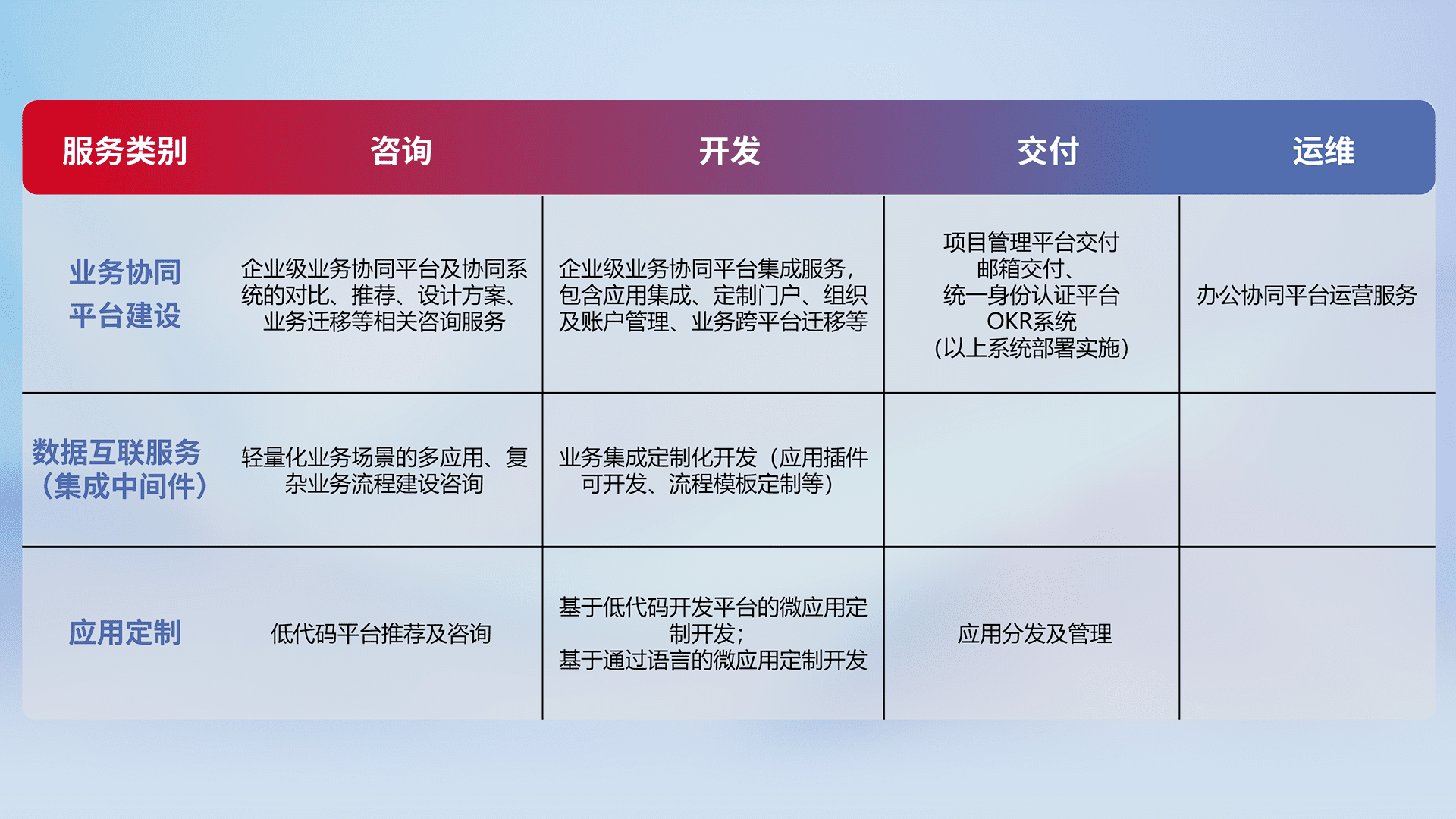 针对钉钉、、、、企微、、IDaas等平台级产品提供产品的规划、、、方案、、交付、、定制化开发等服务,,,,实现如统一协同办公、、智能客户服务、、、混合会议管理、、、智能数据查询、、、、等业务场景,,,实现数字化转型。。。。