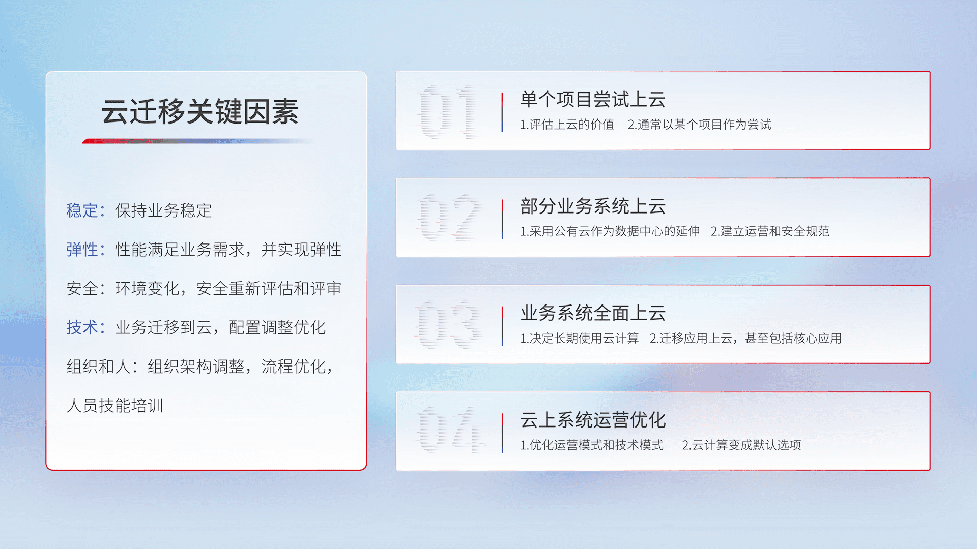 结合实际业务,,,从规划设计、、、、云平台选型、、、云原生改造、、、数据迁移、、、、集成交付,,,迁移全过程为客户识别最佳上云路径,,,,做好风险识别管理,,设计网络架构、、、身份权限、、安全审计合规、、、、操作审计、、、、日志审计、、、监控告警策略、、、、多站点容灾设计等,,,,对云上基础设施进行整体规划,,提升IT治理水平,,以满足弹性、、、高可用、、高性能的需求。。