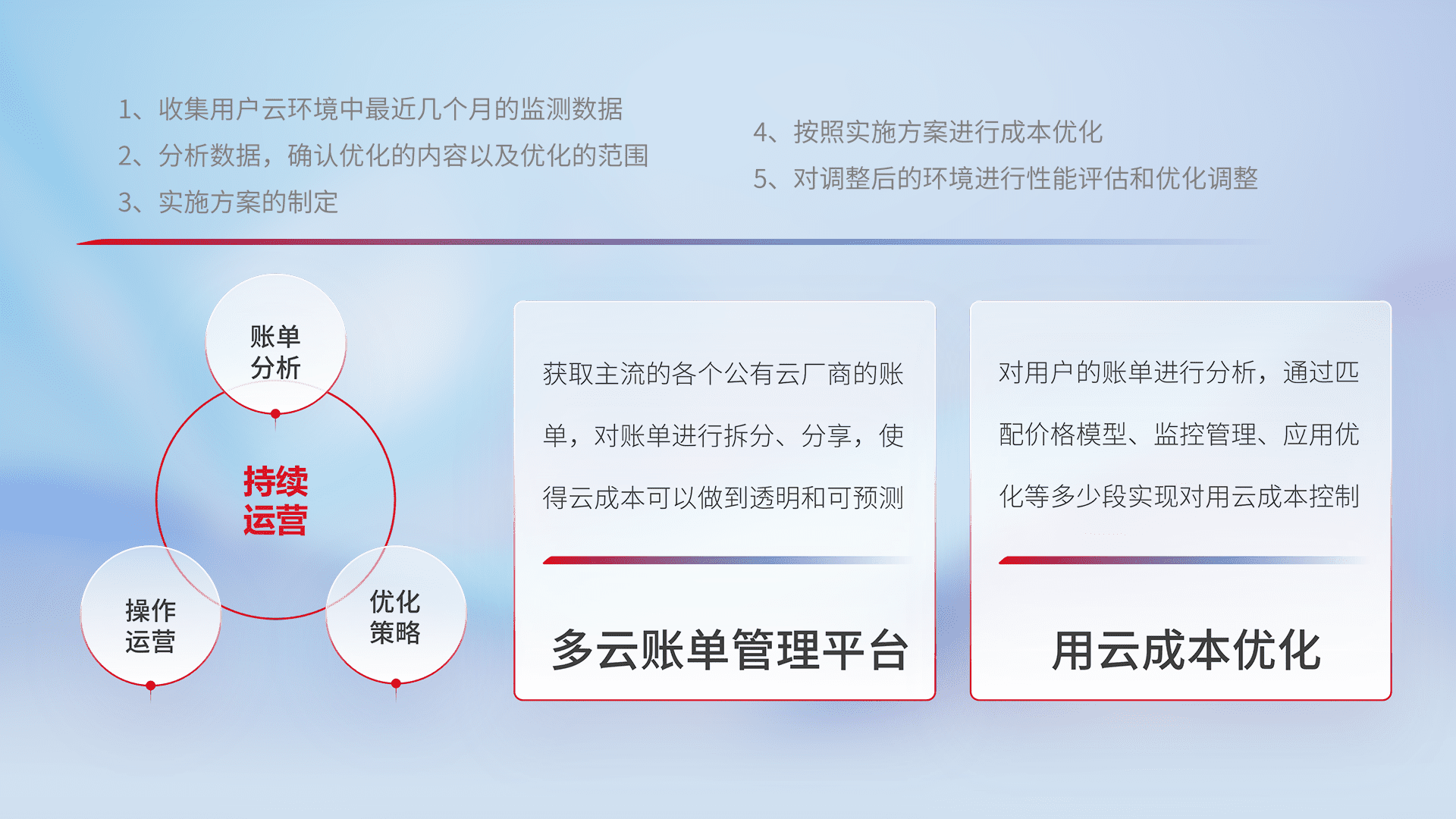 通过多云纳管,,,以统一的资源数据模型把客户的云资源进行抽象和封装,,,进而实现对多云资源的统一操作,,,,保障云资源管理的可靠性、、、、稳定性与可用性。。量身定制化运维内容,,,配置、、、、开发运维、、、、补丁管理、、、备份、、监控、、认证和访问管理、、审计和日常巡检等,,保障在用云过程中的可靠度,,稳定度以及高可用率。。。。