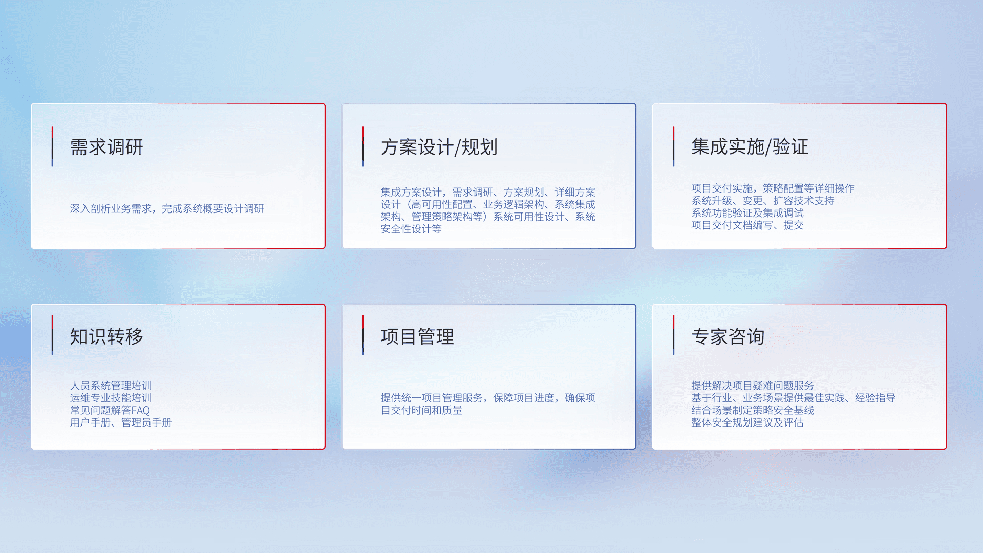 针对客户行业特性,,,,将宏观的安全战略和需求,,,,通过专业的交付服务,,,实现项目落地,,为客户提供标准规范的集成交付服务。。。